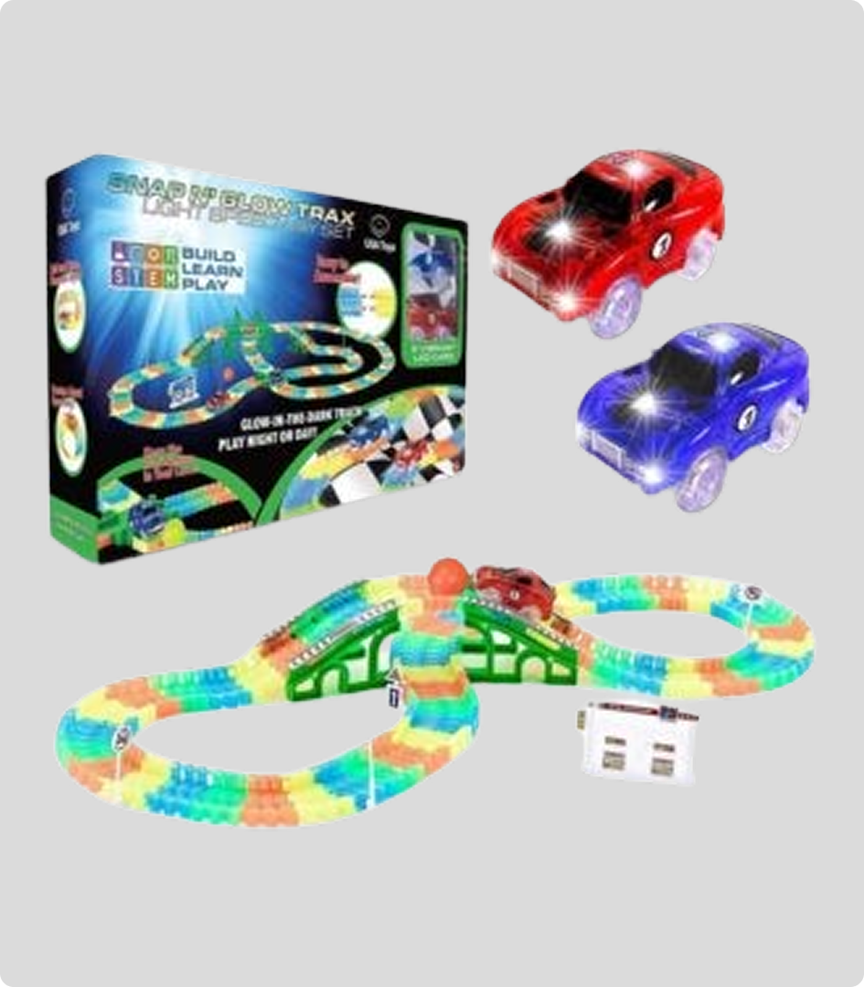 Największy hit wśród dzieci 3–12 lat! Magiczny, elastyczny tor wyścigowy, który świeci w ciemności po naświetleniu lampą. Składasz go dokładnie tak, jak chcesz – pętle, mosty, zakręty 360°, zjazdy i skocznie. Do zestawu dołączone są dwa szybkie autka z diodami LED, które zostawiają za sobą piękną poświatę!