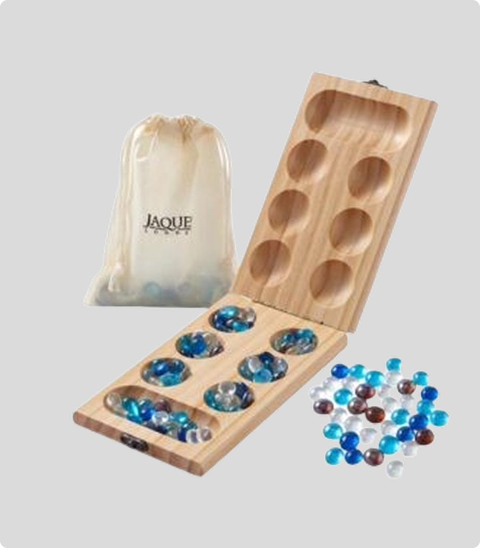 Najpiękniejsza wersja jednej z najstarszych gier świata! Ręcznie rzeźbiona deska z litego drewna hebanowego lub palisandru, 48 naturalnych kamyków (np. tygrysie oko, jaspis, kwarc różowy) oraz dwie większe misy na zdobycze. Elegancka, ciężka, ciepła w dotyku – to nie zabawka, to prawdziwa ozdoba salonu i dziedzictwo na pokolenia.