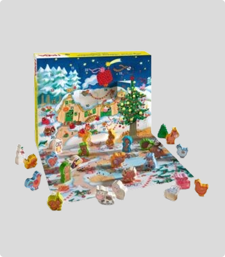 Najpiękniejsza świąteczna tradycja dla najmłodszych! Duży, w 100% drewniany kalendarz adwentowy z 24 szufladkami, w których każdego dnia od 1 do 24 grudnia dziecko odkrywa nowe zwierzątko lub element zagrody: krówkę, konika, owieczkę, świnkę, traktor, płotek, drzewko i wiele więcej. Na Wigilię czeka największa niespodzianka – figurka Świętego Mikołaja!